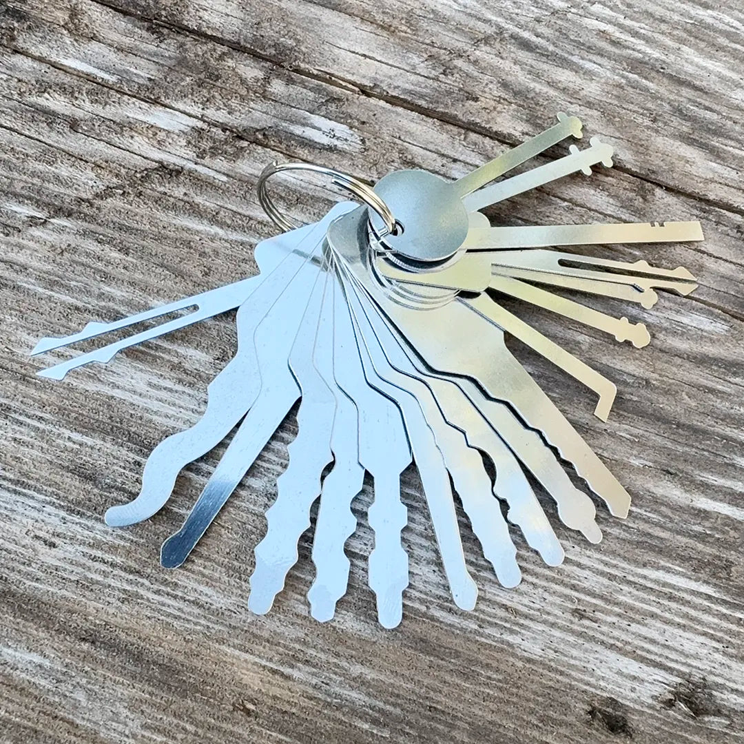 This set isn’t about precision pin-picking, it’s about experimentation and feel. Each pick is cut from stainless steel and organized on a compact key ring, giving you a range of warded profiles and jiggler styles that can open surprising doors. Use it as your “try-first” set before moving to traditional picks.