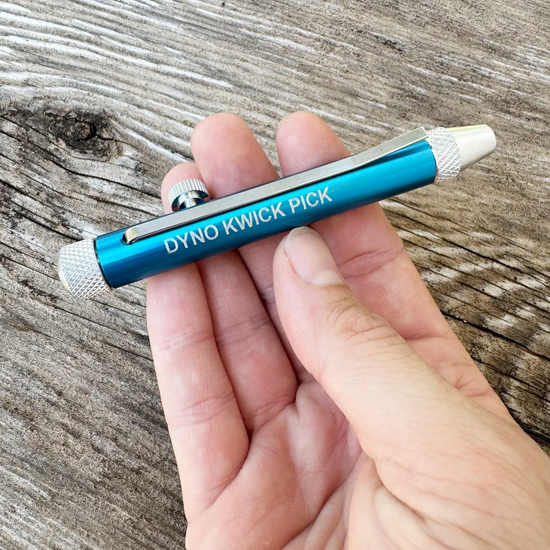 The Dyno Kwick Pick is an all-in-one solution, which includes the tool body, spring-loaded Snake Rake and friction held Pocket Clip/Tension Tool.